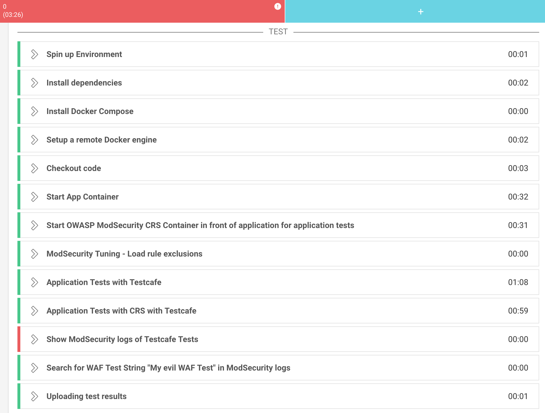 The time taken to pull and start the Core Rule Set container and to run the application tests are only a small part (approx. 1 minute and 30 seconds in this PoC) of the overall testing process (approx. 3 minutes and 30 seconds in my example).